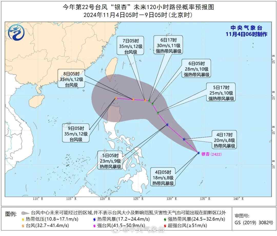 今天(4日)早晨,今年第22号台风“银杏”(热带风暴级,英文名称:Yinxing;名字来源:中国;名字意义:一种原产于中国的树)在西北太平洋洋面上生成,早晨5点钟其中心位于菲律宾马尼拉东偏南方向约1450公里的洋面上,中心附近最大风力有8级(18米/秒)。