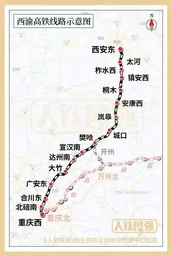 西渝高铁安康至重庆段正线全长约478公里,自安康西站起,经陕西省安康市,重庆市城口县,四川省达州市、广安市,重庆市合川区、北碚区,引入重庆枢纽重庆西站,共设安康西、岚皋、城口、樊哙、宣汉南、达州南、大竹、广安东、合川东、北碚南、重庆西11座车站。其中重庆西为既有车站,其他为新建车站。