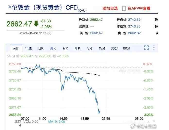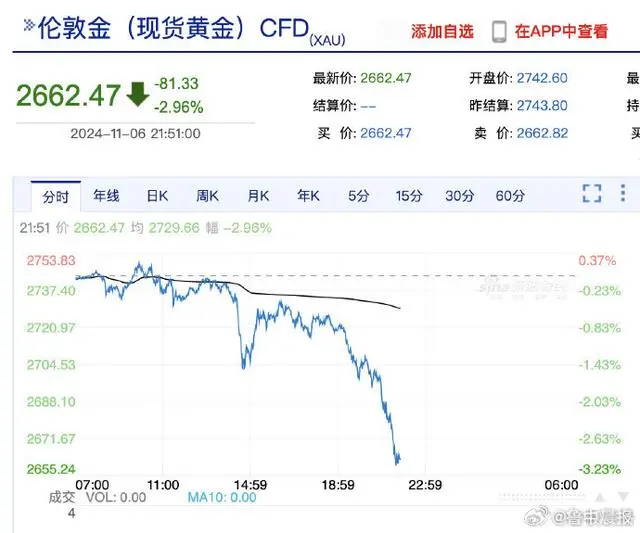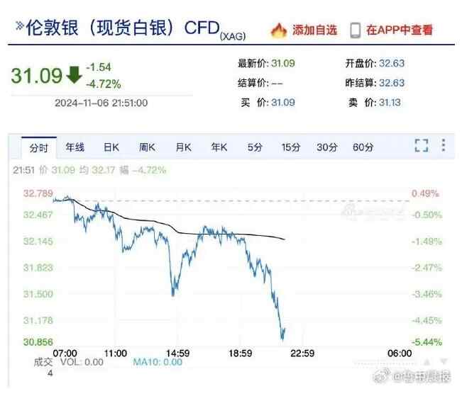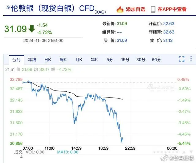 11月6日,国际贵金属持续走低。现货白银持续走低,跌幅扩大至5%,跌破31美元/盎司。现货黄金大跌近3%,跌破2660美元/盎司。