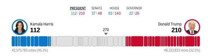 美媒预测特朗普暂获210张选举人票,哈里斯暂获112张