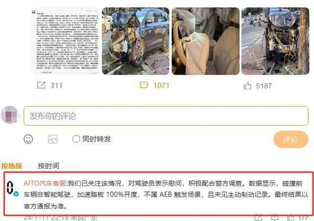 另据界面新闻报道,事故发生后车主曾发文质疑车辆存在突然加速和刹车失灵。但当时AITO问界汽车客服通过官方微博账号曾回应称,“车辆加速踏板100%开度,不属于AEB触发场景,且未见主动制动记录。”