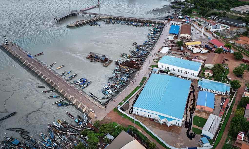 这是2024年7月8日在几内亚比绍首都比绍拍摄的板丁渔业码头和中企投建的水产品加工存储综合设施(右侧蓝顶建筑区域)(无人机照片)。新华社记者韩旭摄