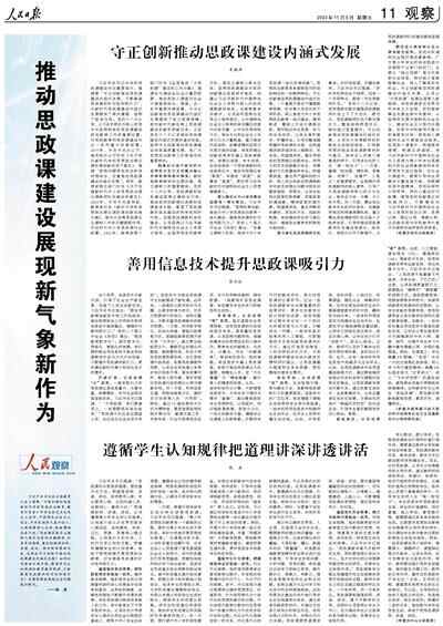 习近平总书记在全国教育大会上强调:“不断加强和改进新时代学校思想政治教育,教育引导青少年学生坚定马克思主义信仰、中国特色社会主义信念、中华民族伟大复兴信心,立报国强国大志向、做挺膺担当奋斗者。”思政课是落实立德树人根本任务的关键课程,本质是讲道理,重在把道理讲深、讲透、讲活。面对新形势新任务,怎样在守正创新中推动思政课建设内涵式发展?如何运用新技术新手段、遵循学生认知规律和教育教学规律,不断提高思政课的针对性和吸引力?本期观察版围绕这些问题进行探讨。