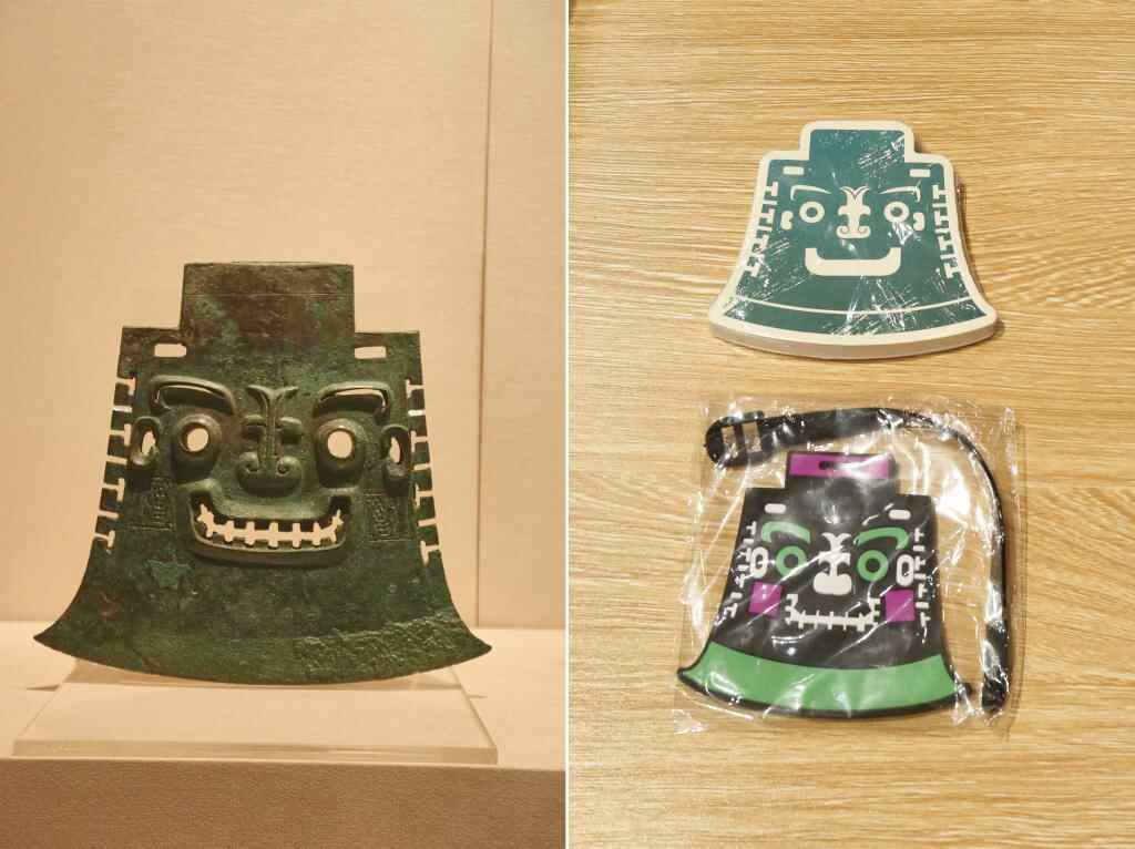 拼版照片:左侧为2022年5月15日拍摄的亚醜钺;右侧为5月15日拍摄的以亚醜钺为原型的文创产品——便利签和行李牌(下)。新华社发(郭志华 摄)