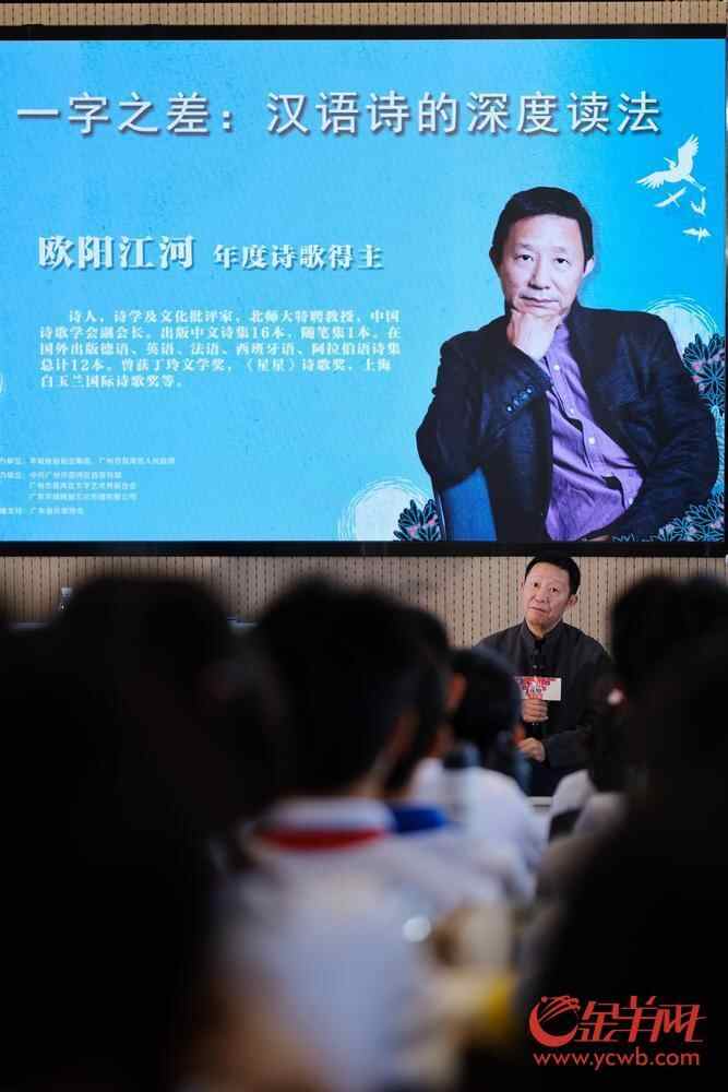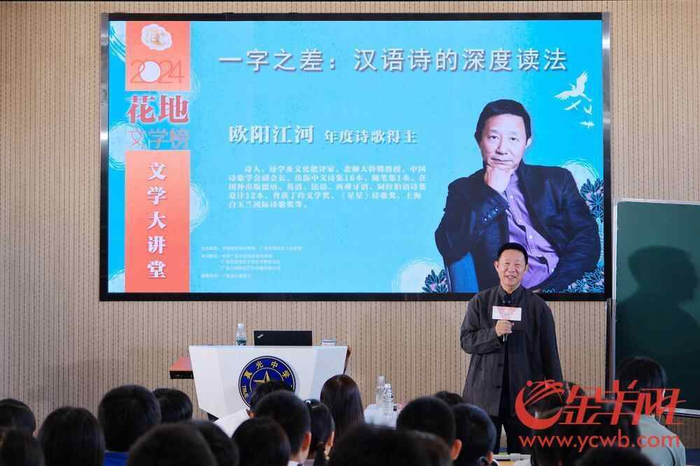 11月8日,2024花地文学榜系列活动之花地文学大讲堂在广州市真光中学初中部校本部举办。2024花地文学榜年度诗歌得主、诗人欧阳江河走进校园,以“一字之差:汉语诗的深度读法”为主题,与荔湾学子们分享如何把诗读“活”。
