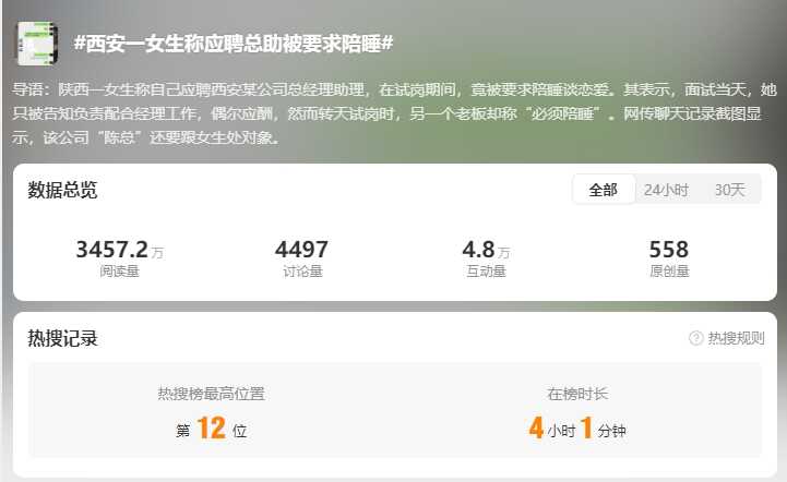 近日,陕西一女生称自己应聘西安某公司总经理助理,在试岗期间,竟被要求陪睡谈恋爱。相关话题登上微博热搜,引发网友关注和热议。