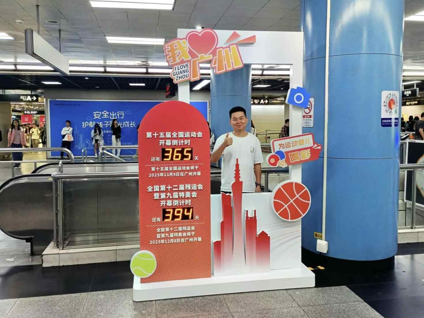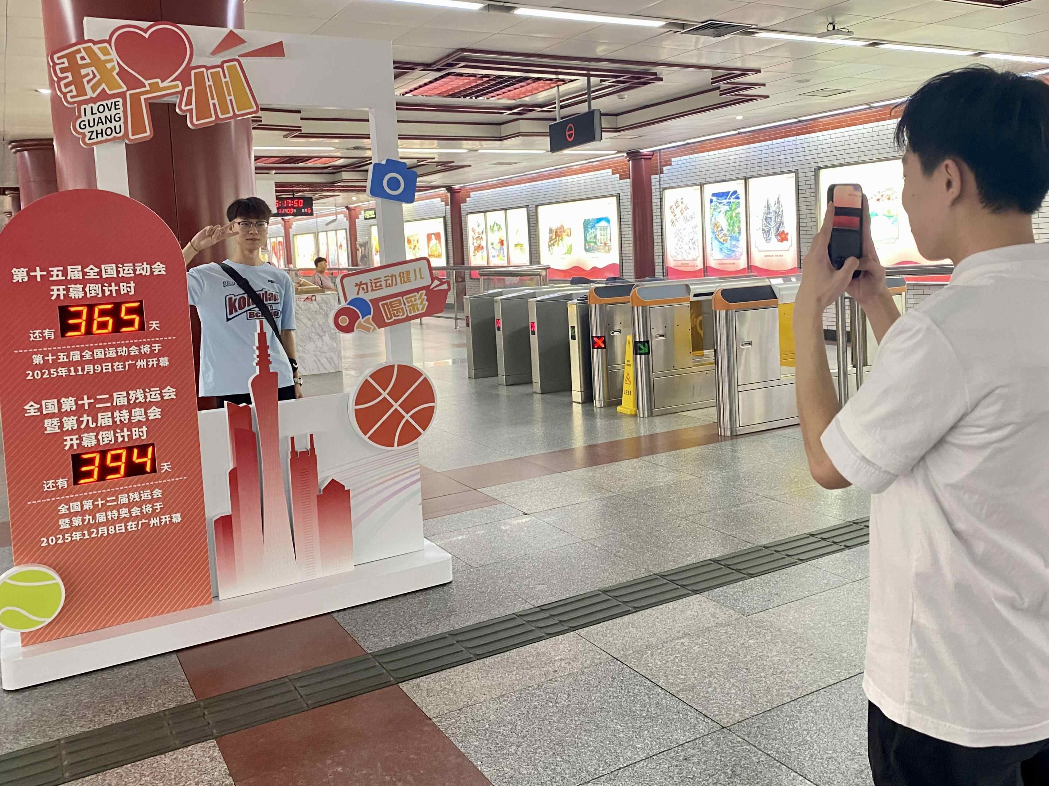 即日起,广州南站、机场南、广州火车站、公园前、黄村、东湖、纪念堂、农讲所、小北、体育西等10个地铁站设置了十五运会和残特奥运会倒计时打卡点,乘客可以一边拍照留念,一边为即将到来的运动盛会加油喝彩。