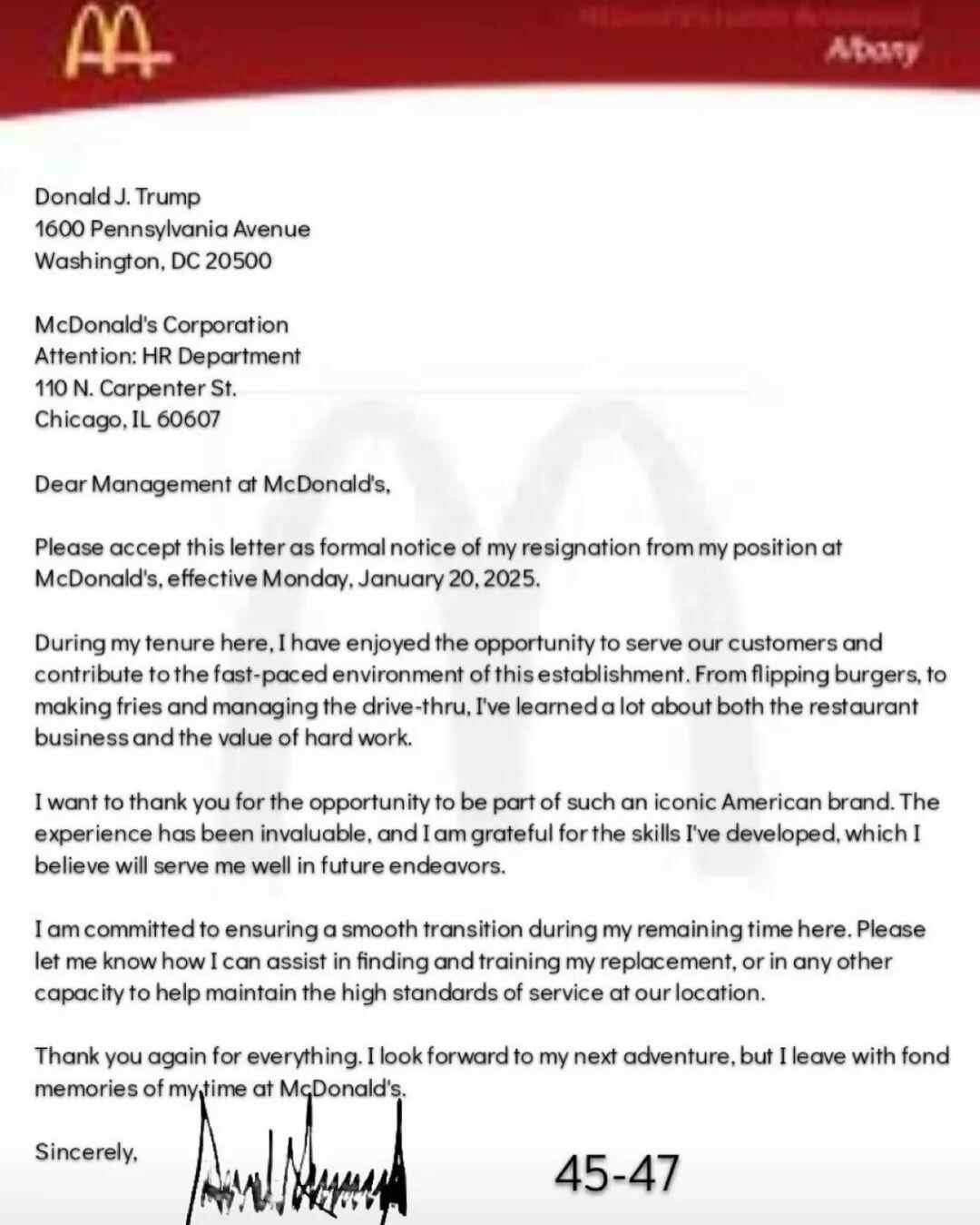 据美媒报道,近日,美国当选总统特朗普的长子小唐纳德上传一张他父亲的“辞职信”。内容提到特朗普会在2025年1月20日辞去麦当劳的工作,并形容工作期间非常享受服务客人的机会。