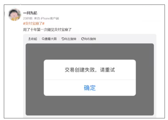 据多名网友反馈,支付宝于今日上午出现服务异常,付款时显示“支付失败”“交易创建失败”“服务异常”等。