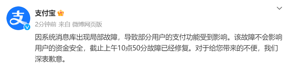 因系统消息库出现局部故障,导致部分用户的支付功能受到影响。该故障不会影响用户的资金安全,截至上午10点50分故障已经修复。对于给您带来的不便,我们深表歉意。