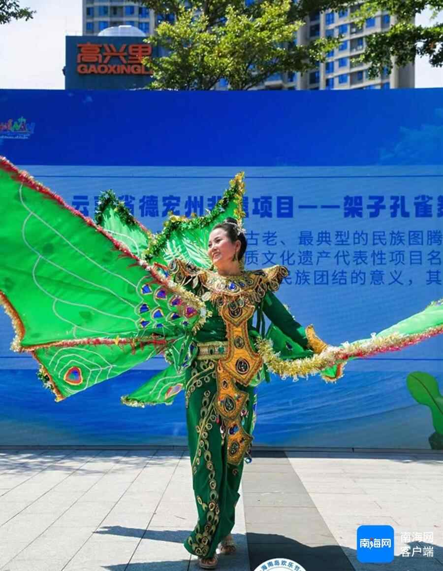 “热闹!震撼!”今年是73岁的国家非物质文化遗产代表性项目傣剧省级传承人朱宽涵跳架子孔雀舞的第53个年头,也是他第一次来海南表演,“从云南到海南,展演‘非遗’项目,引领民众深入领略架子孔雀舞最原始的精髓,吸引了不少游客争相拍照合影留念。”