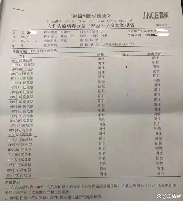 架不住对方一番“花好稻好”的“话术”,9月17日,张先生来到上海光泽医院,医生随即要求张先生做了一系列检查,随后告知其“HPV病毒四项指标阳性,其中高危两项,低危两项”。另外,附带炎症。主治医生反复强调,应该赶紧用药进行治疗,不然会越来越严重甚至有癌变的可能。