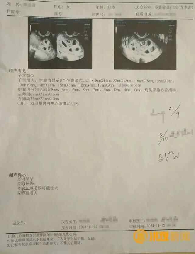 11月12日,侯女士再次来到医院进行复查,没想到的是,检查结果宫腔内显示9个孕囊紧靠,均见原始心管搏动。