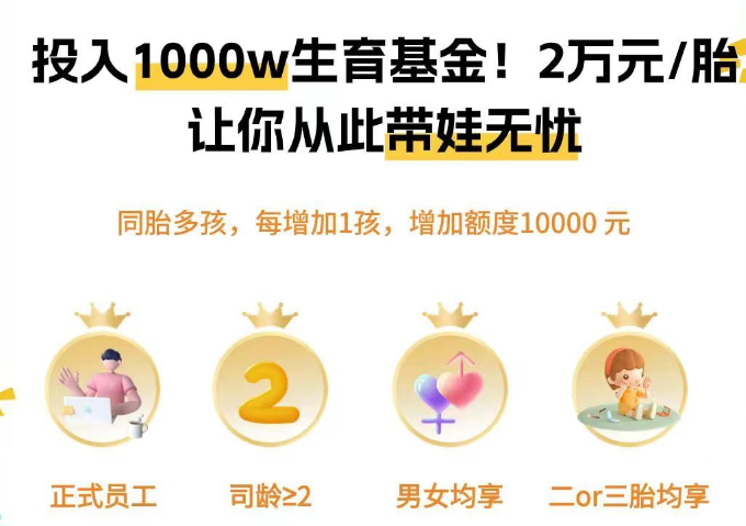 今年6月,广州一家互联网公司发布“新生代计划”,将设立“新生代基金”并注入超千万元的预算,向司龄满2年的在职员工发放每胎2万元的生育基金,上不封顶,男女员工一视同仁。
