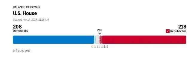 当地时间11月13日,据美联社预测,美国共和党在众议院已获得218个席位,锁定众议院的控制权。