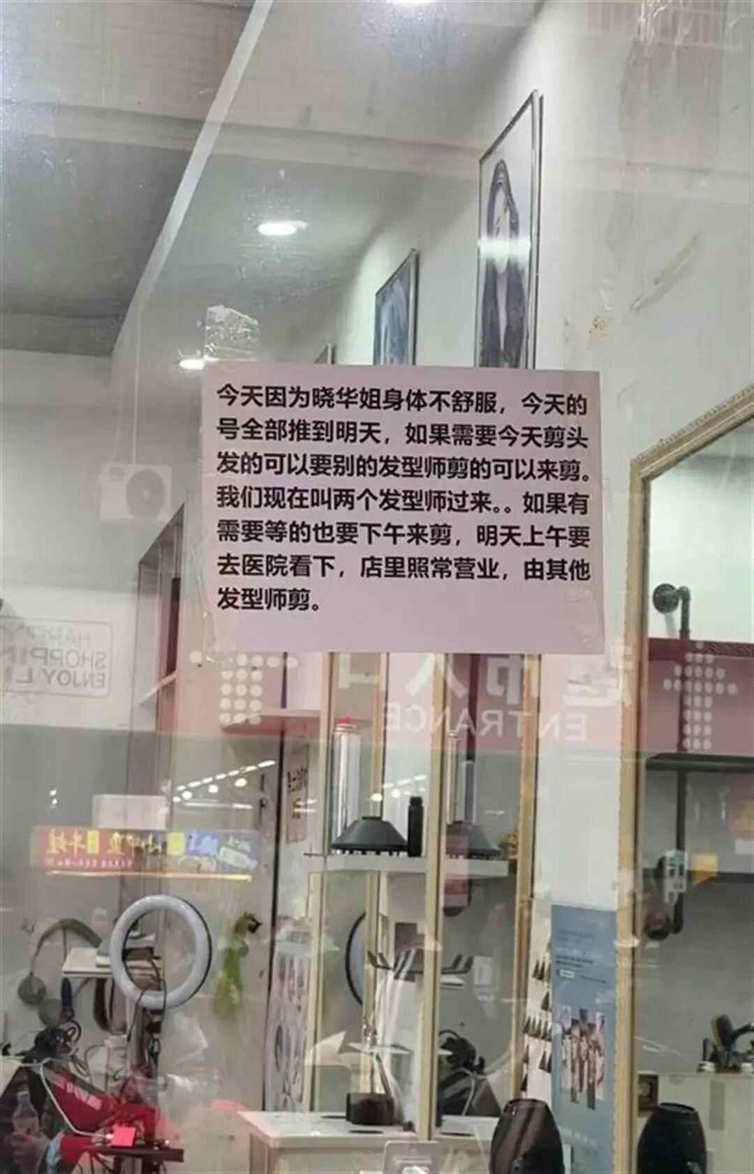 15日,一位网友发布视频称,“晓华今天剪头发的时候被120拉走了。”另有多位网友发布的视频显示,晓华的理发店橱窗玻璃上贴了一张A4纸,上面写着:“因为晓华姐身体不舒服,今天的号推到明天下午,明天上午要去医院看一看,店里照常营业,由其他发型师剪发。”