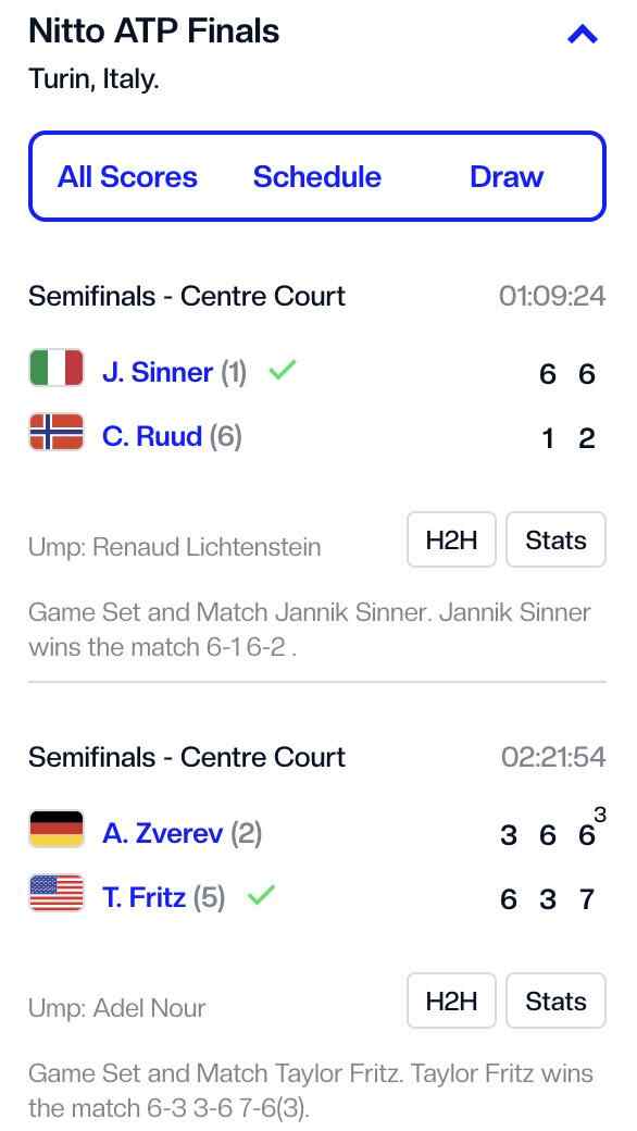 ATP年终总决赛半决赛,辛纳6-1/6-2横扫鲁德,连续两年闯入年终总决赛决赛,将与弗里茨争夺最终冠军归属。