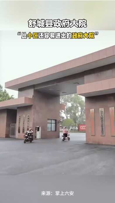 根据视频介绍,舒城县政府大院随意进出无门卡,自由停车不收费。舒城一位市民说,“从我们有印象记事的时候,大门永远是敞开的,也没有看到有人被阻拦在门外。外卖小哥,或者有时候车子没地方停,群众进出很方便。”