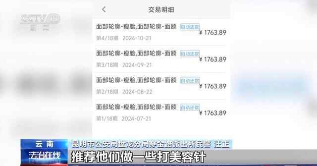 昆明市公安局盘龙分局穿金路派出所民警 汪正:推荐他们打美容针,或者瘦脸针,还有一些轻美容项目,价格在2万到3万元不等。有钱的受害人就直接支付了,没有钱的他会一步一步引导你去各个小额贷款的平台进行贷款。