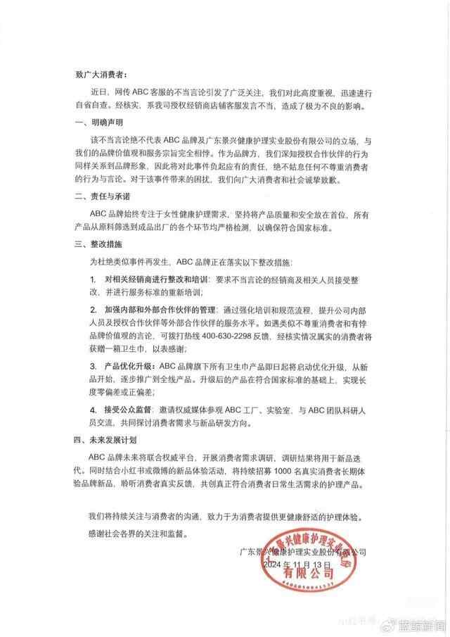 陷入风波后,ABC官方于11月13日发布道歉声明称,感谢广大消费者对ABC的关注和反馈。对于近日网传客服不当回复造成的困扰深感抱歉。但这次致歉消费者却并不买账,有网友表示ABC并非诚恳道歉,并表示ABC的声明稿件出现序号错误。14日,ABC再次在评论区致歉。截至目前,经搜索发现,多家ABC卫生巾官方授权店铺下架了相关产品,ABC旗舰店已没有产品在售。