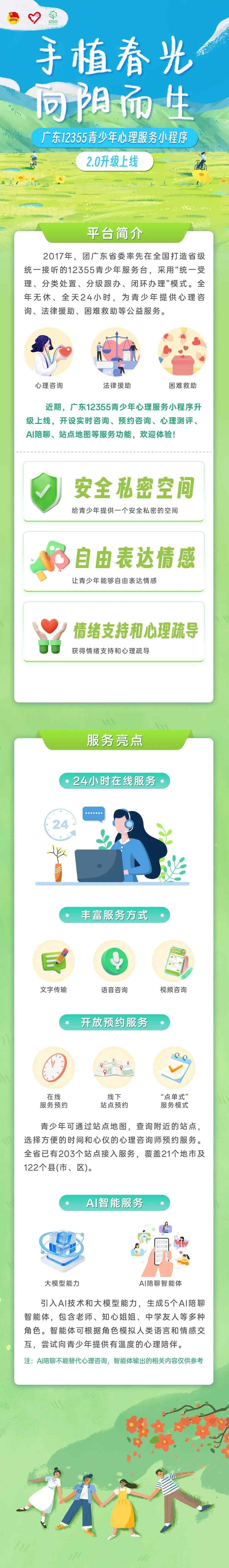 有需要的青少年在微信搜索“广东12355”并点击进入小程序,可即时获得专业心理服务。广东12355小程序2.0,聚合了全省近2000名心理咨询师志愿者,全年无休、全天24小时轮替值班,帮助解决学业压力、欺凌、睡眠、亲子关系、成瘾行为、人际关系等问题,时刻守护陪伴在青少年身边。