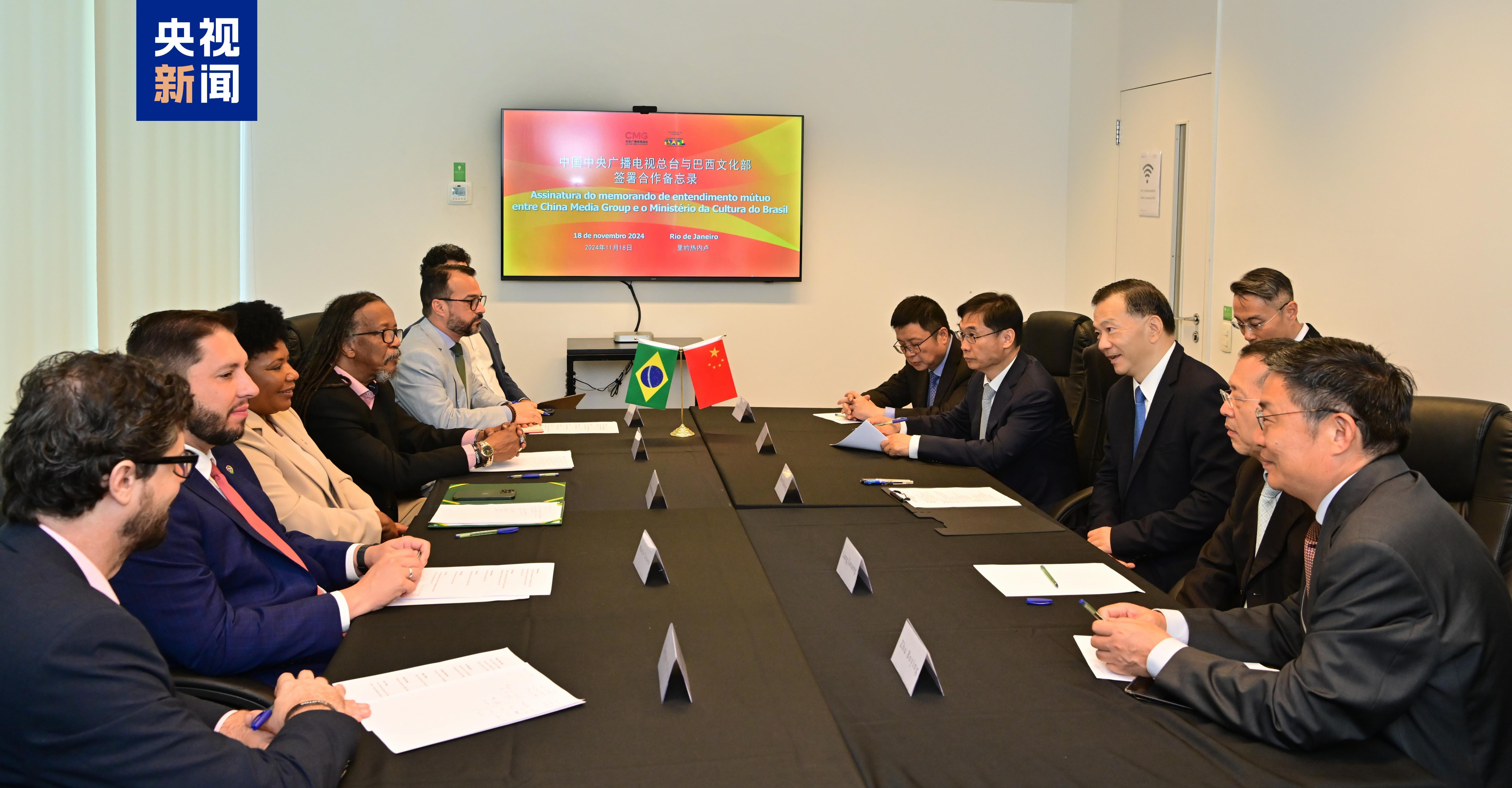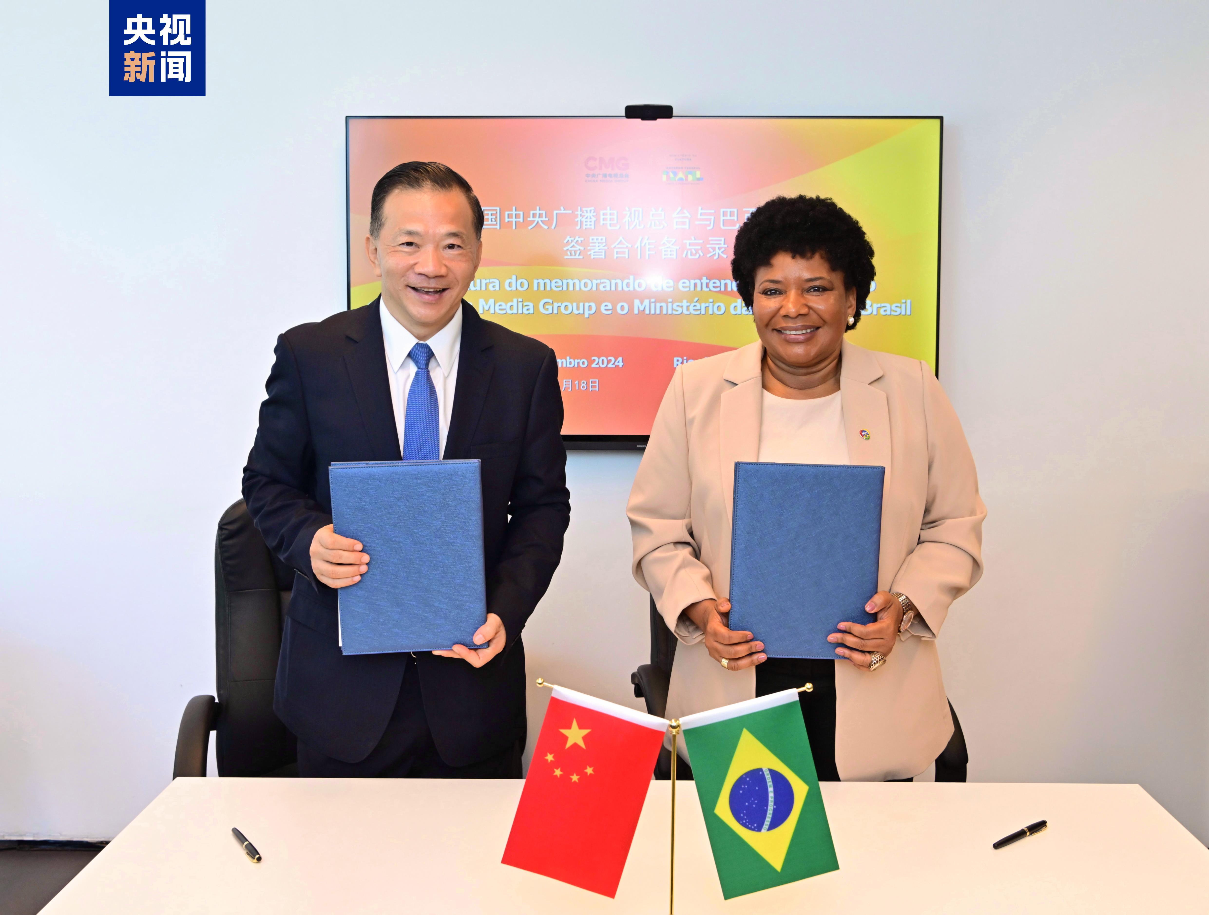 当地时间11月18日,中国中央广播电视总台与巴西文化部在里约热内卢签署合作备忘录。双方在视听节目制作、文化遗产传播、人员技术交流等领域达成一致。中宣部副部长、中央广播电视总台台长慎海雄与巴西文化部长梅内塞斯代表双方签约。