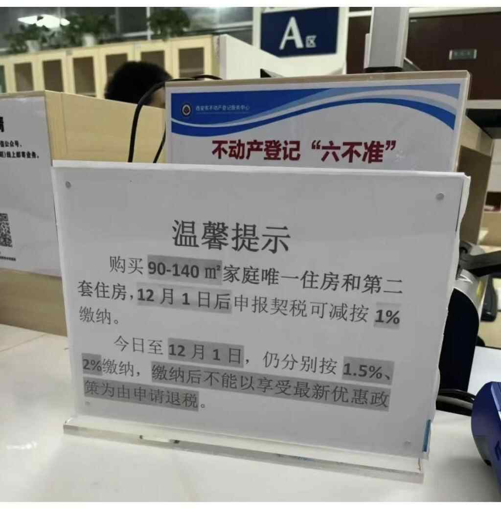 为提高信息透明度,部分城市的不动产证登记部门在窗口放置提示牌,提醒购房者:购买90-140平方米家庭唯一住房和第二套住房,12月1日后申报契税可减按1%缴纳。