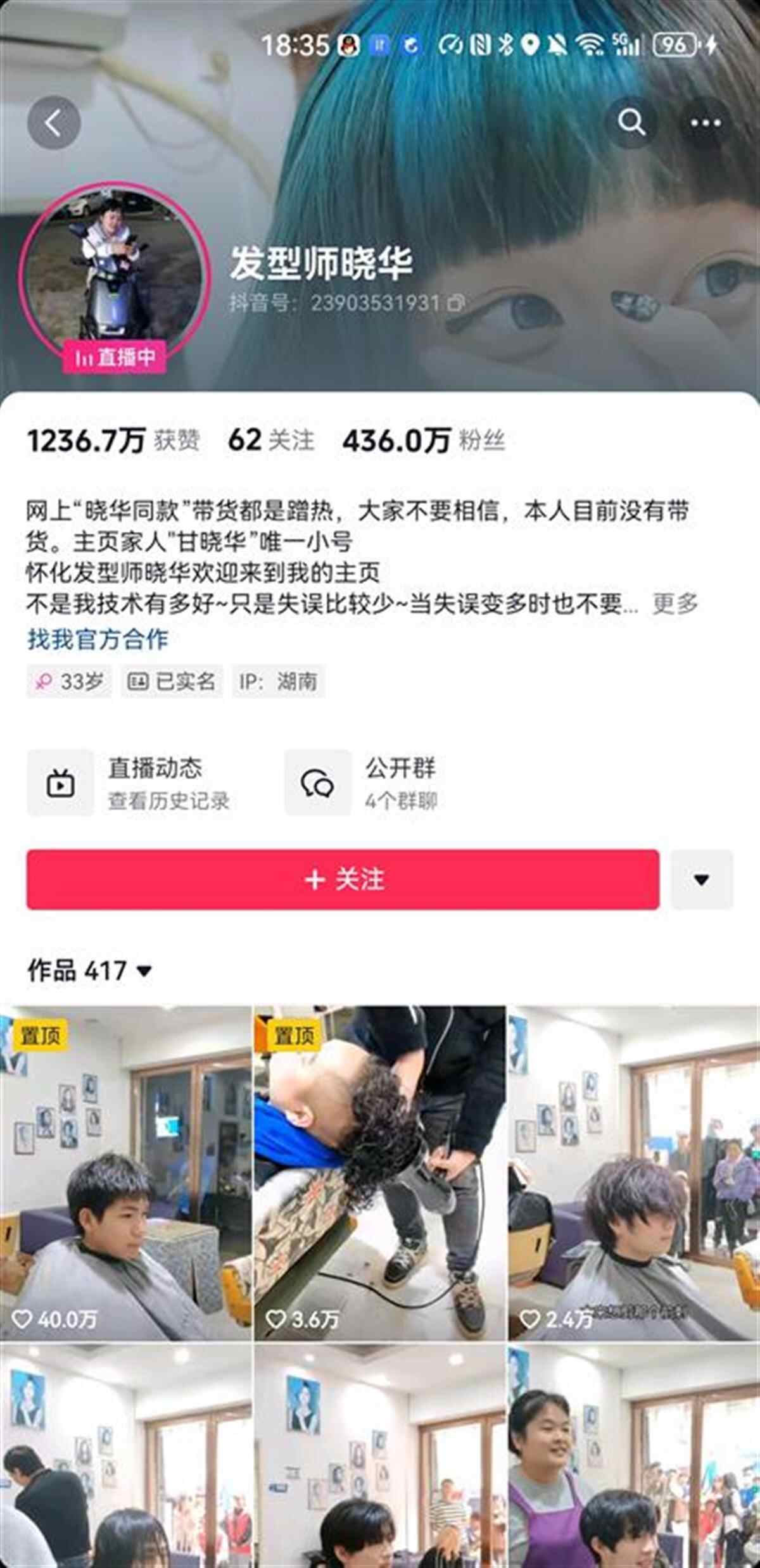 “不是我技术有多好,只是失误比较少,当失误变多时,也不要嘲笑我,多多包容,谢谢!”流量和顾客一股脑涌来,涌进这个只有二三十平方米的小店,“发型师晓华”的抖音账号粉丝量一路狂飙。