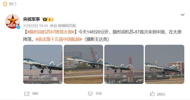 2024年11月3日,“央视军事”官方微博发布消息称:“今天14时20分许,隐形战机苏-57首次来到中国,在太原降落。”