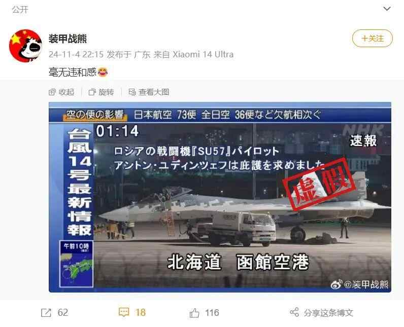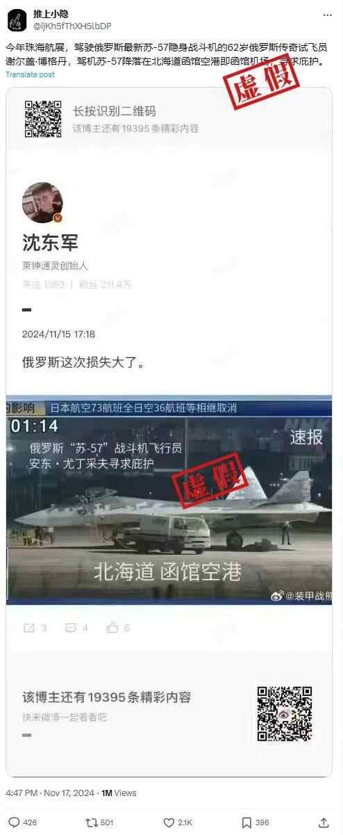 一条在X平台上点击量过百万的推文宣称,“在今年的珠海航展中,驾驶俄罗斯最新苏-57隐身战斗机的62岁俄罗斯传奇试飞员谢尔盖·博格丹降落在日本北海道函馆空港,寻求庇护。”