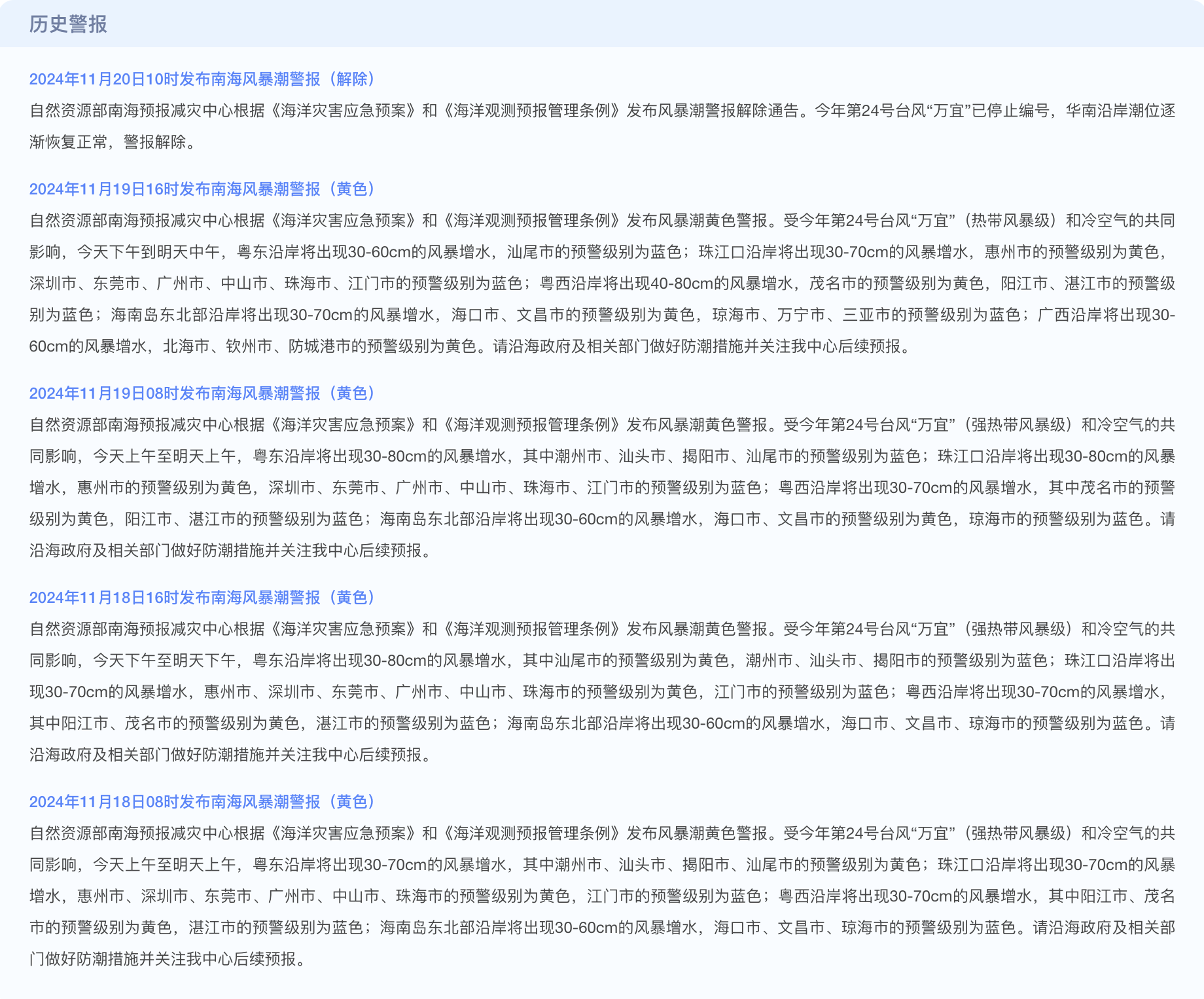 据自然资源部南海预报减灾中心“历史警报”显示,2024年11月18日8:00自然资源部南海预报减灾中心发布南海风暴潮黄色警报。警报提到:“受今年第24号台风‘万宜’(强热带风暴级)和冷空气的共同影响,今天上午至明天上午,粤东沿岸将出现30-70cm的风暴增水,其中潮州市、汕头市、揭阳市、汕尾市的预警级别为黄色;珠江口沿岸将出现30-70cmn的风暴增水,惠州市、深圳市、东莞市、广州市、中山市、珠海市的预警级别为黄色,江门市的预警级别为蓝色;粤西沿岸将出现30-70cm的风暴增水,其中阳江市、茂名市的预警级别为黄色,湛江市的预警级别为蓝色;海南岛东北部沿岸将出现30-60cm的风暴增水,海口市、文昌市、琼海市的预警级别为蓝色。”