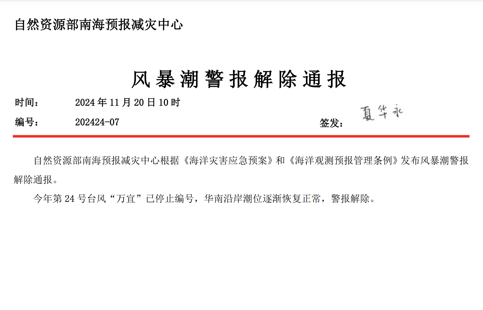 记者从自然资源部南海预报减灾中心获悉,截至11月20日10:00,今年第24号台风“万宜”已停止编号,广东沿岸潮位逐渐恢复正常,南海风暴潮黄色警报现已解除。