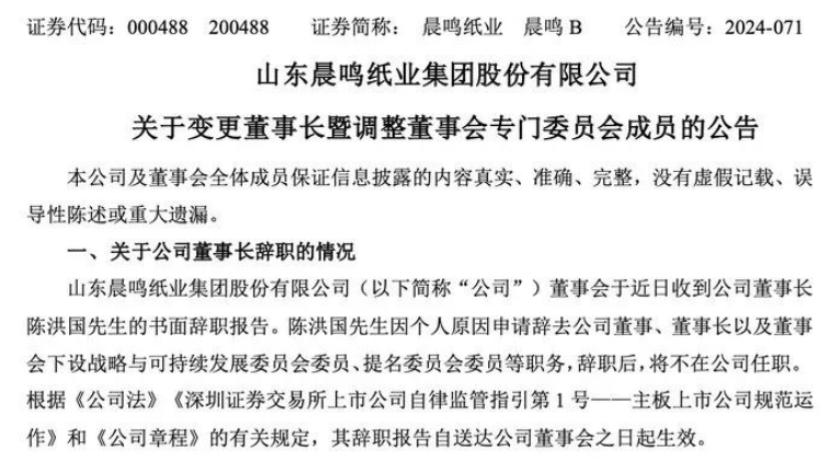 值得注意的是,此前11月8日晚间,该公司曾公告换帅。在晨鸣纸业工作了37年的陈洪国宣布辞去董事长一职,其妻子李雪芹也辞去了公司副总经理一职。