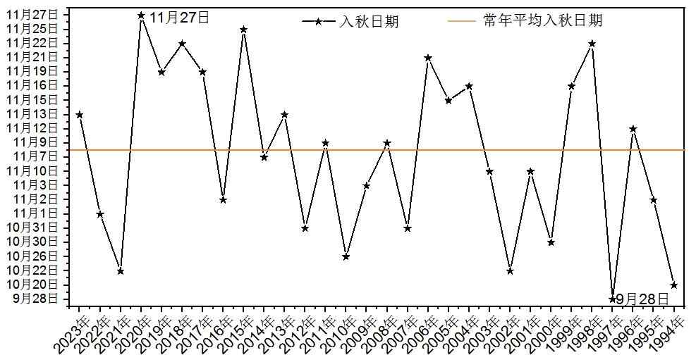 根据近三十年(1994年-2023年)入秋一周内的气象数据显示,超8成因冷空气的到来而成功入秋,其中较强和弱冷空气推动占比分别为33.3%、53.3%。