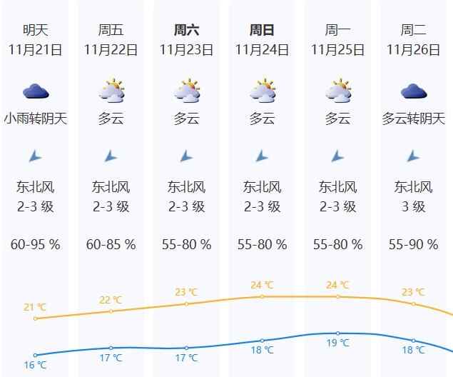 21日,小雨转阴天,下午天色渐转明朗,气温16-21℃;