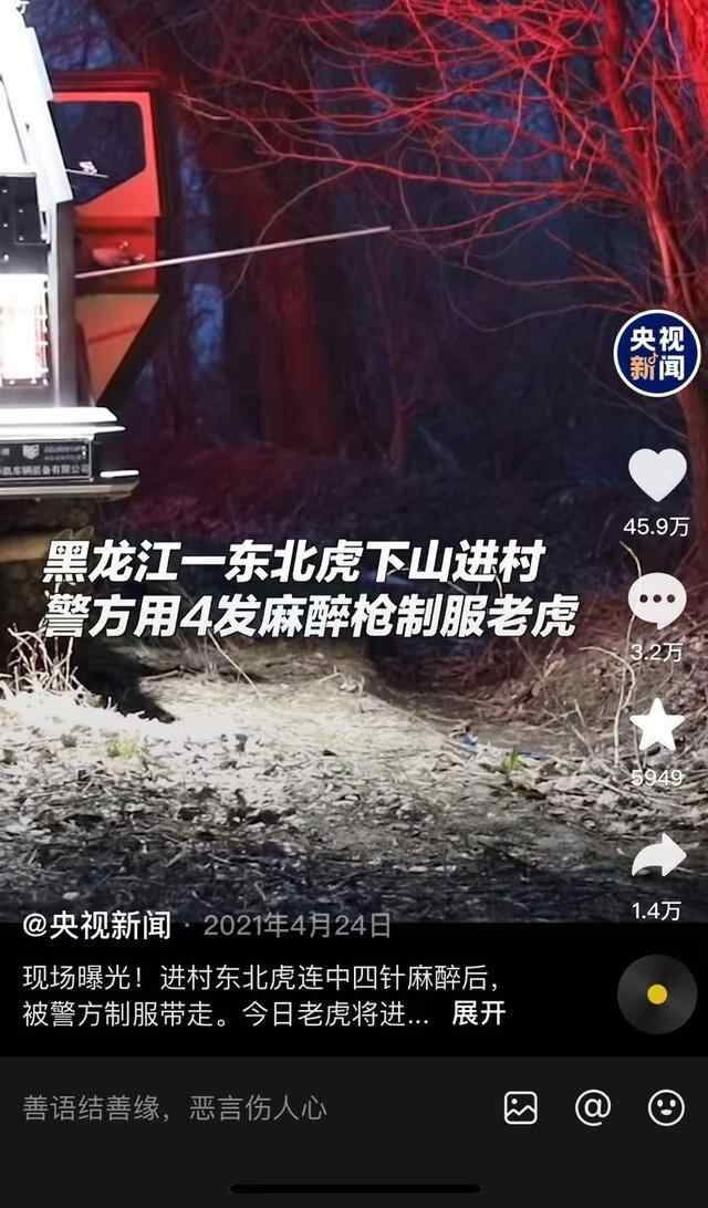 记者通过查找、比对发现,这些发布的视频实为2021年4月24日央视新闻发布的野生东北虎“完达山一号”被制服的视频画面。据媒体报道,2021年4月23日,野生东北虎“完达山一号”进入黑龙江省密山市白鱼湾镇临湖村,黑龙江省有关部门对其进行了野外救助,并于2021年5月18日将其放归长白山老爷岭山脉。