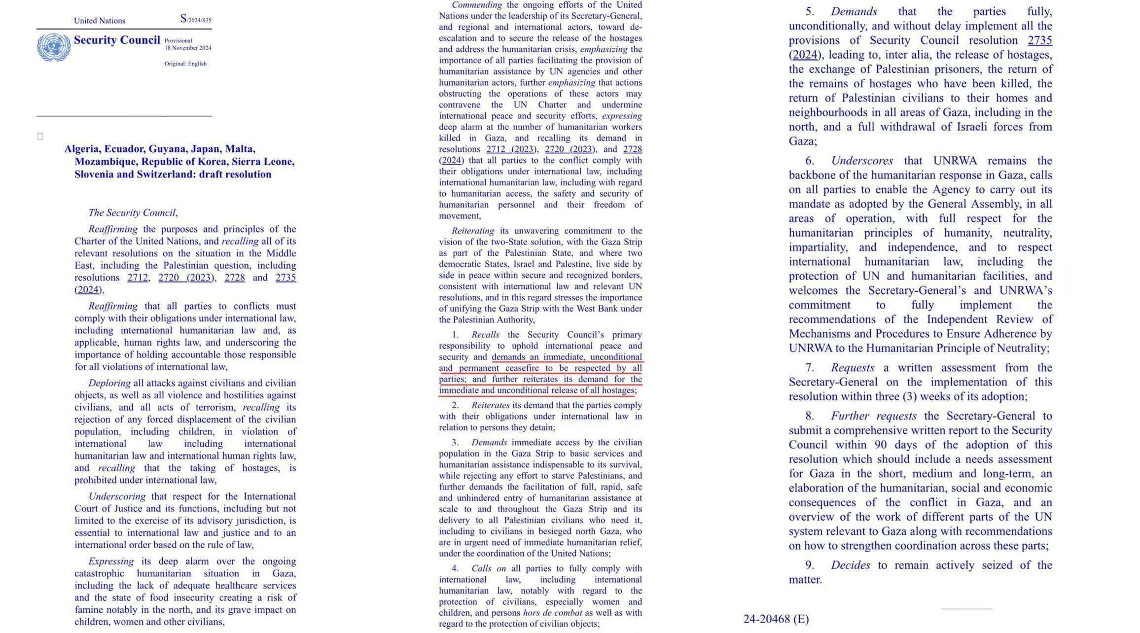 这一决议草案“要求所有各方立即、无条件和永久停火”,并“进一步重申立即、无条件释放所有人质的要求”。该草案还“特别指出,联合国近东巴勒斯坦难民救济和工程处仍然是加沙人道主义应急行动的支柱”。