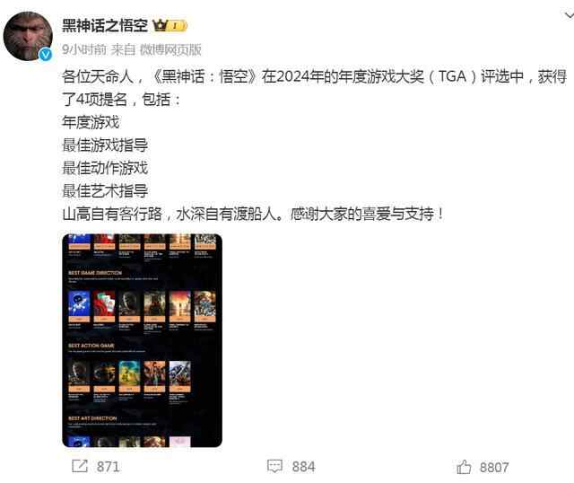 各位天命人,《黑神话:悟空》在2024年的年度游戏大奖(TGA)评选中,获得了4项提名,包括:年度游戏、最佳游戏指导、最佳动作游戏、最佳艺术指导。山高自有客行路,水深自有渡船人。感谢大家的喜爱与支持!