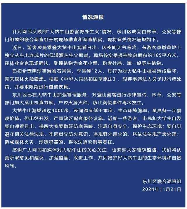 11月21日,云南省昆明市东川区联合调查组发布《情况通报》称,针对网民反映的“大牯牛山游客野外生火”情况,东川区成立由林草、公安等部门组成的联合调查组开展现场勘查和调查核实,现将有关情况通报如下。