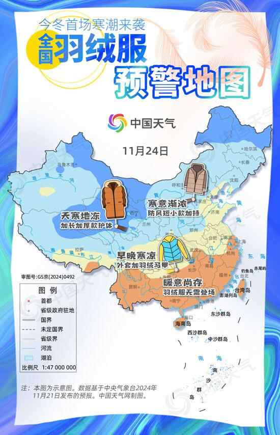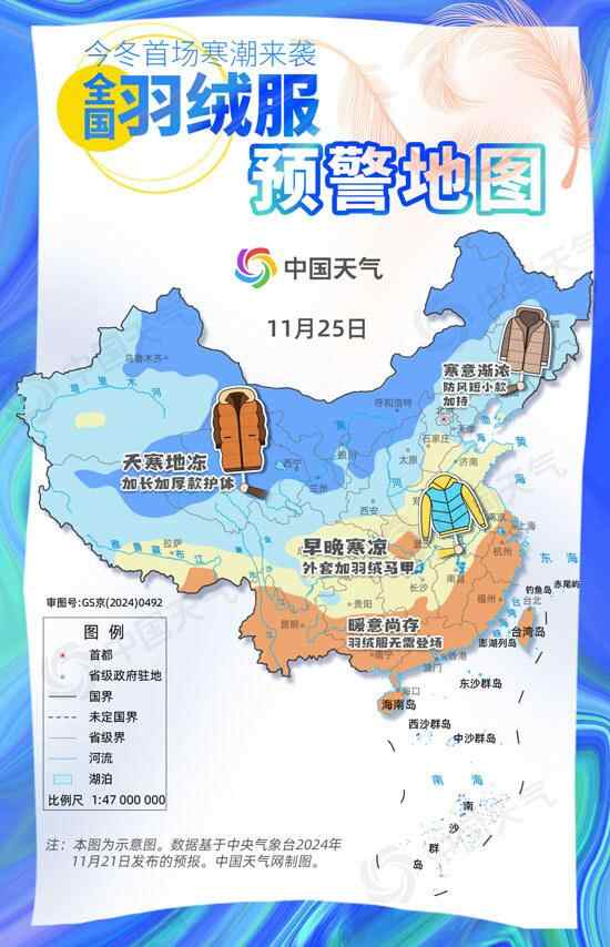“寒潮来袭别耍酷,不穿羽绒扛不住。”今冬首场寒潮天气过程即将发货,明天(11月23日)至27日将影响我国大部地区,降温范围波及25个以上省区市,局地气温会骤降14℃以上,终极保暖装备羽绒服请求出场。中国天气网推出全国羽绒服预警地图,看你需要加长加厚款还是防风短小款。
