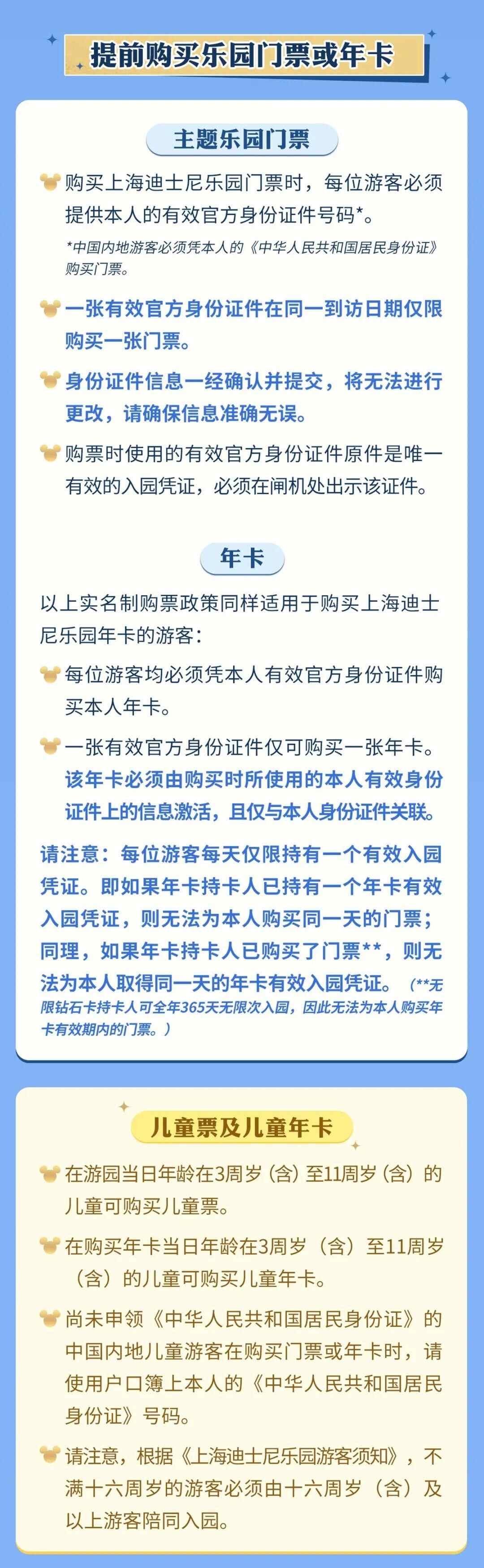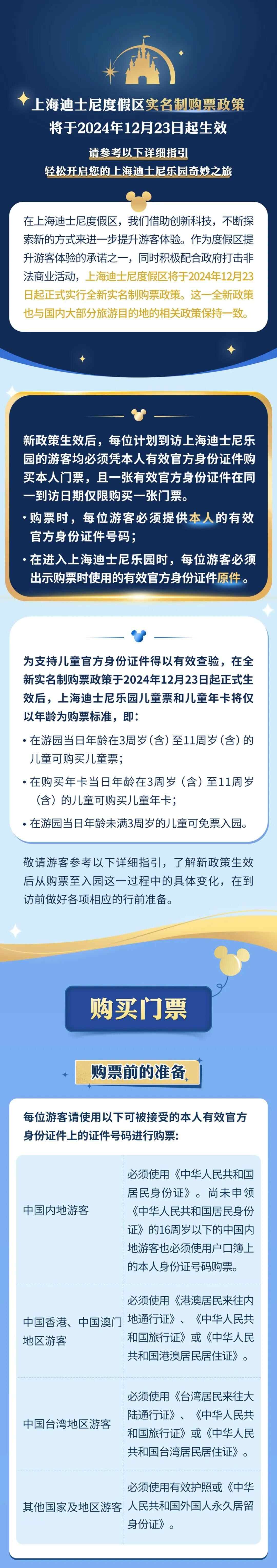 11月20日,上海迪士尼度假区宣布,为支持儿童官方身份证件得以有效查验,在全新实名制购票政策于2024年12月23日起正式生效后,上海迪士尼乐园儿童票和儿童年卡将仅以年龄为购票标准,即: