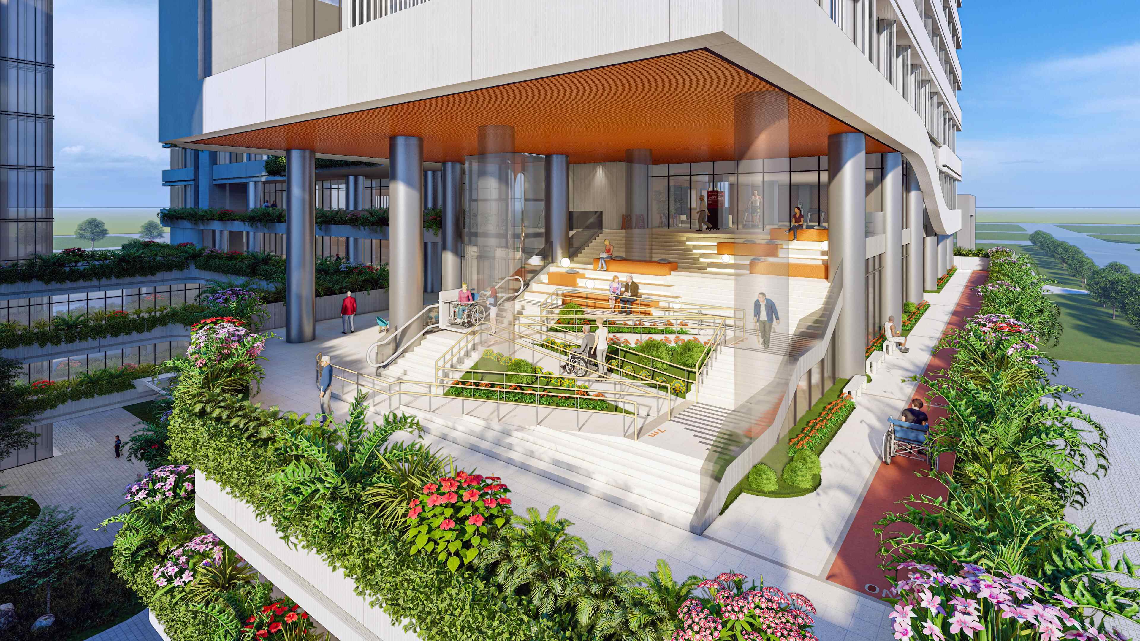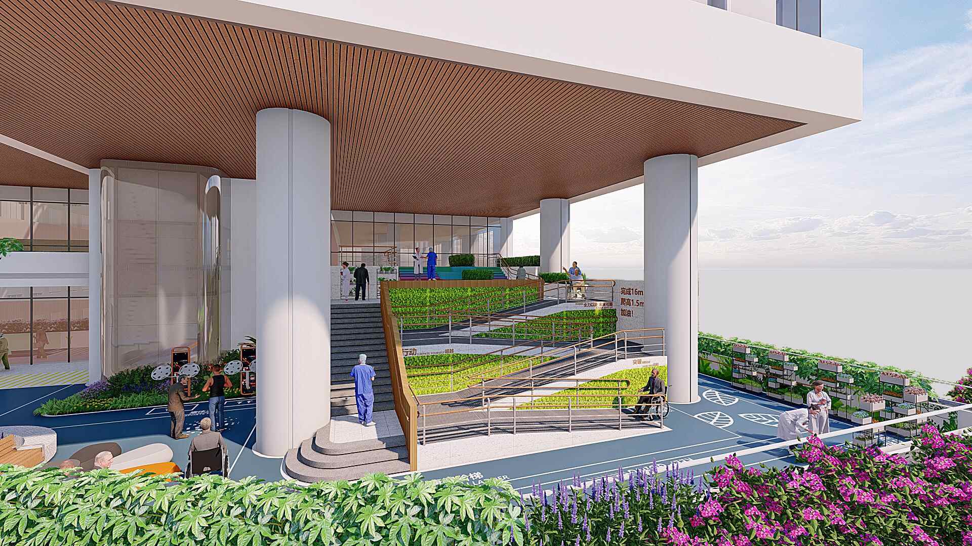广东省工伤康复中心二期工程项目以“疗愈花园、生命之谷”为设计主题,采用围合的内向型布局手法,突破原地扩建用地狭小的局限性,在中部设置核心筒,南北两侧预留最大化空间,为功能转换、科室扩建提供灵活性,实现院区全生命周期发展。同时,合理设置纵横交通,实现医患分流、截污分流,打造高效专业的医疗流程。此外,步道、连廊、平台、病房将处处展现立体景观,利用四五层退台与架空平台,打造独树一帜的空中康复花园,每个病房层都设置中心治疗区与小型康复花园,全方位打造自然生态康复环境。走廊、步道加宽设计,满足患者身心和社会功能特点,打造和谐友善的康复环境。