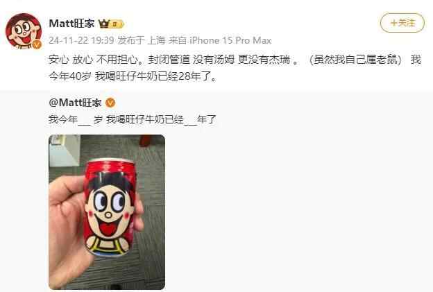 11月22日晚,旺旺集团首席营运官蔡旺家在微博发文回应称,“安心、放心,不用担心。封闭管道,没有汤姆,更没有杰瑞。我今年40岁,我喝旺仔牛奶已经28年了。”旺旺三公子蔡旺庭也回复粉丝留言称“明显有人在搞事”。
