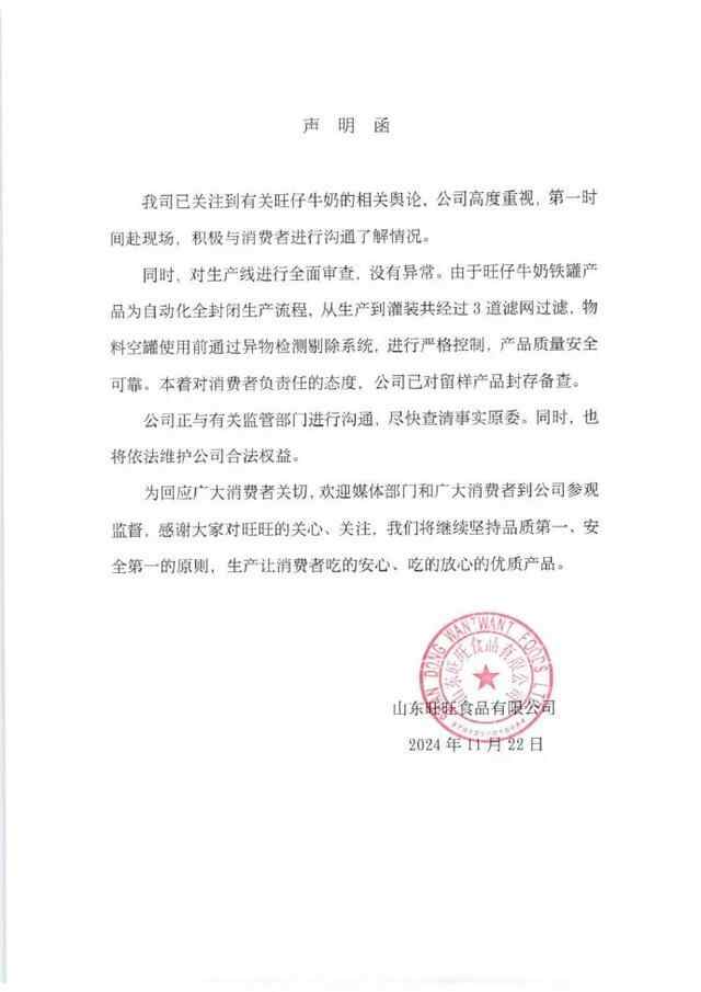 11月23日凌晨,旺旺集团针对近日旺仔牛奶相关舆论发布说明,称公司高度重视,第一时间赴现场,积极与消费者进行沟通了解情况。同时对生产线进行全面审查,没有异常。公司已对留样产品封存备查。正与有关监管部门进行沟通,尽快查清事实原委。同时,也将依法维护公司合法权益。
