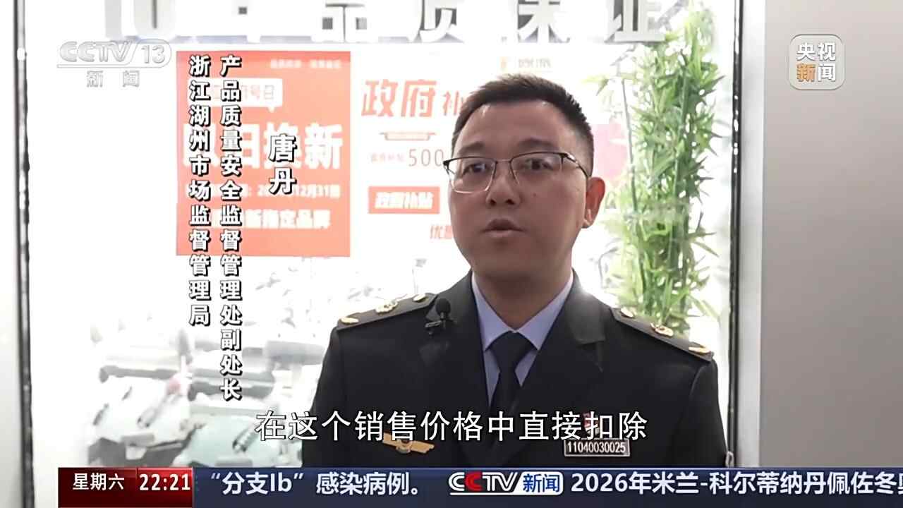 浙江湖州市场监督管理局产品质量安全监督管理处副处长 唐丹:这部分补贴是由财政来承担的,首先商家在销售价格中直接扣除,由商家进行垫付,然后待商家将所有的材料报到系统后台,由市场监管、商务和公安部门联合审核通过之后,再由财政直接补贴给商家。