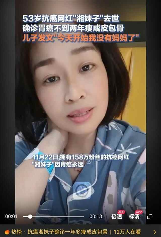 11月22日,百万粉丝抗癌网红“努力坚强的湘妹子-阿妹”因胃癌去世,终年53岁,其确诊不到两年瘦成皮包骨的样子,令人心痛。22日,湘妹子的儿子发布讣告,悲伤地说:从今天开始,我没有妈妈了!