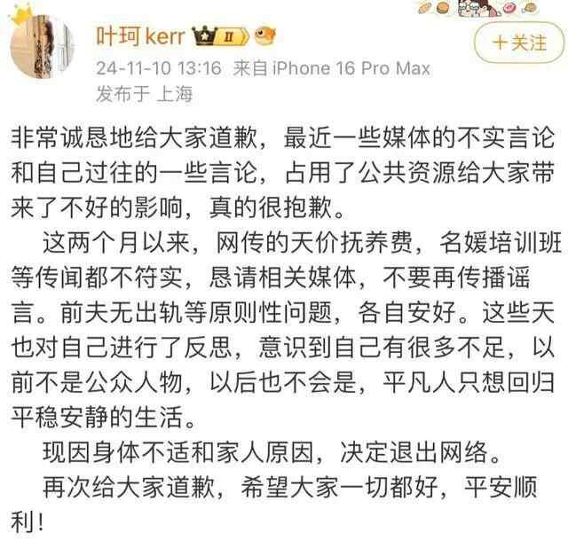 11月,在新电影开始宣传前,叶珂发文,为自己过往的言论占用公共资源而道歉,表示自己也将退出网络。她称网传的天价抚养费,名媛培训班等传闻都不符实。前夫无出轨等原则性问题,各自安好。