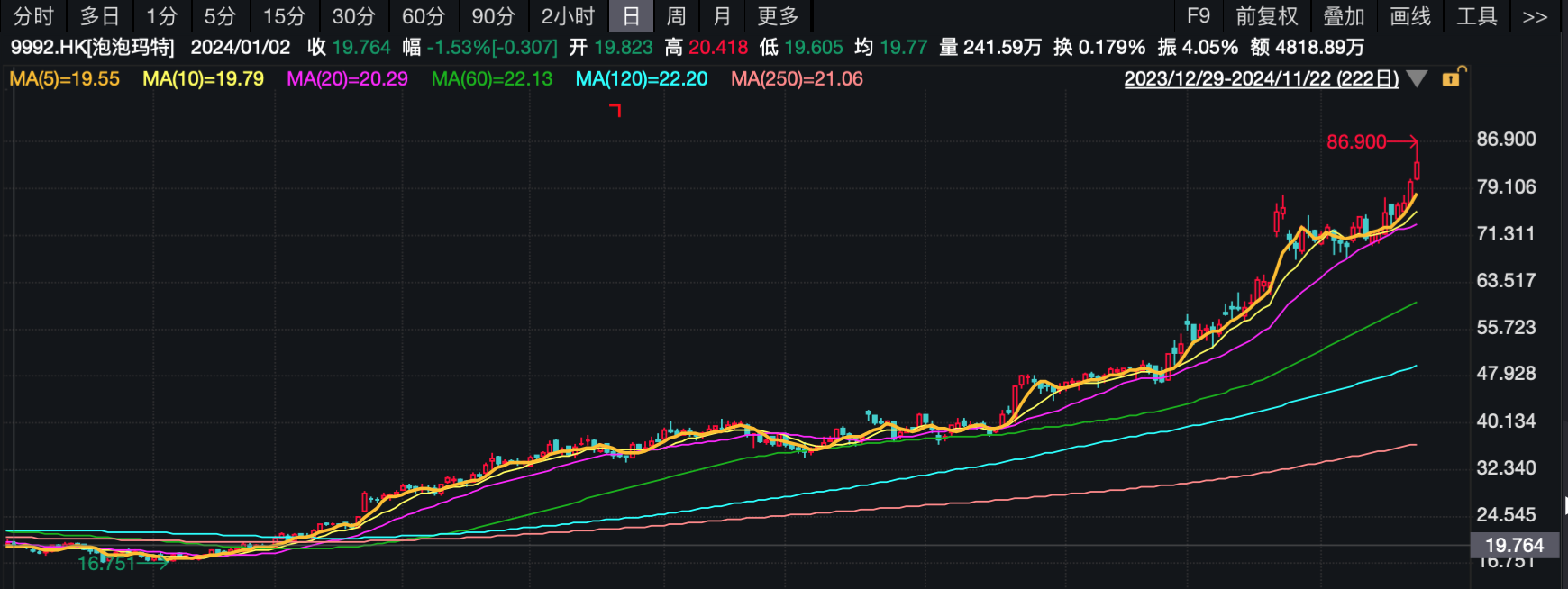 与此同时,泡泡玛特的股价也持续回升,截至11月22日港股收盘,泡泡玛特报83.45港元/股,今年以来股价上涨超过320%,市值重回千亿港元。