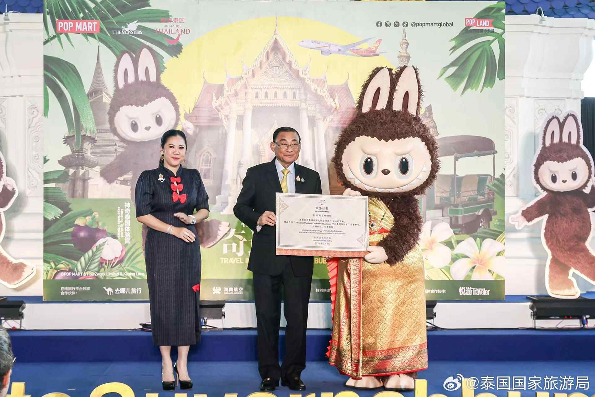 据泰国国家旅游局的消息,今年7月1日,泰国旅游与体育部、泰国国家旅游局联合泡泡玛特、去哪儿网共同推出“拉布布奇遇泰国”项目,并在泰国素万那普国际机场举办了“拉布布欢迎仪式”。LABUBU还被授予“神奇泰国体验官”的称号。