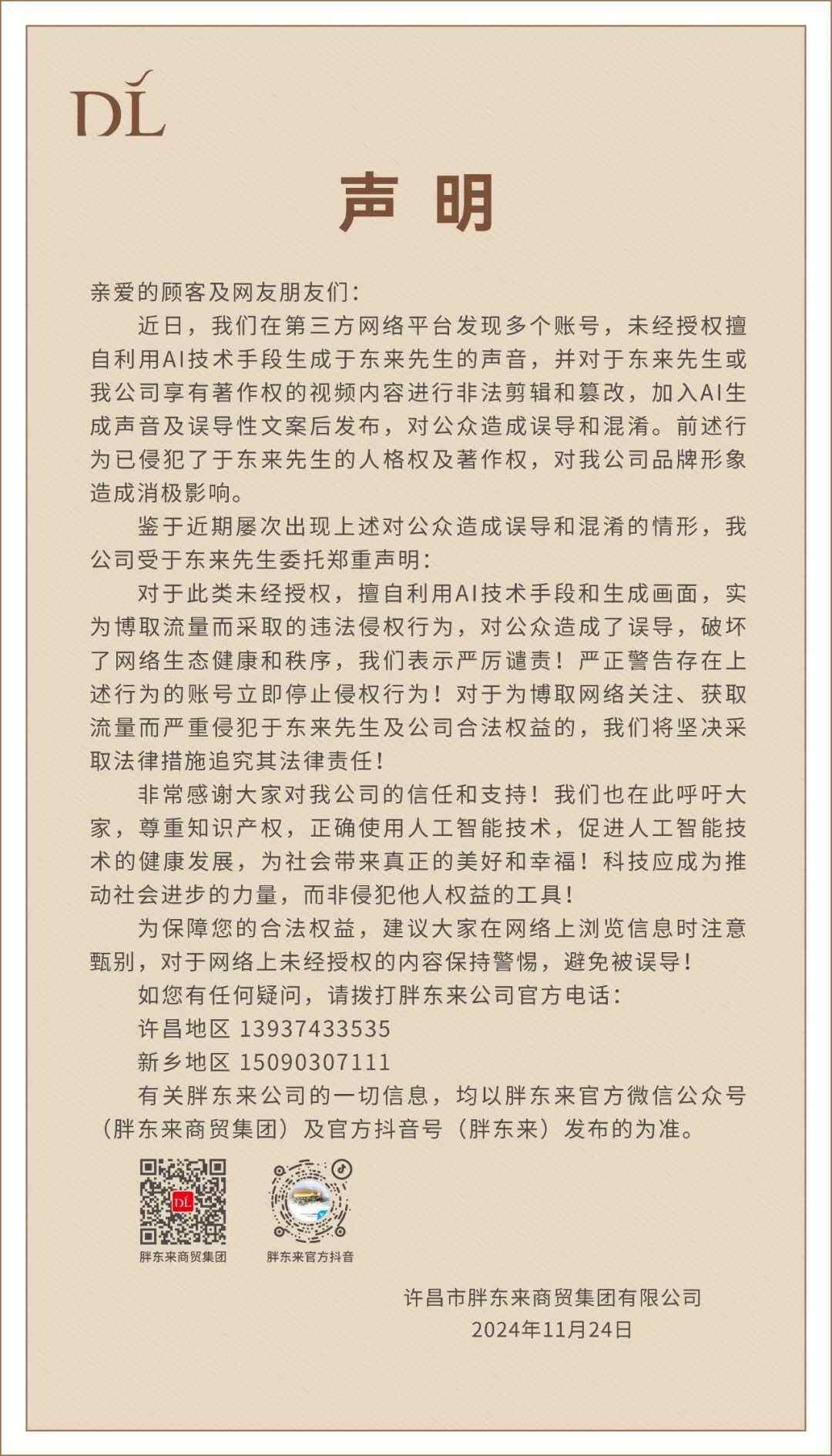 11月24日下午,胖东来商贸集团发布声明,称近日在第三方网络平台发现多个账号,未经授权擅自利用AI技术手段生成于东来先生的声音,并对于东来先生或胖东来商贸集团享有著作权的视频内容进行非法剪辑和篡改,加入AI生成声音及误导性文案后发布,对公众造成误导和混淆。